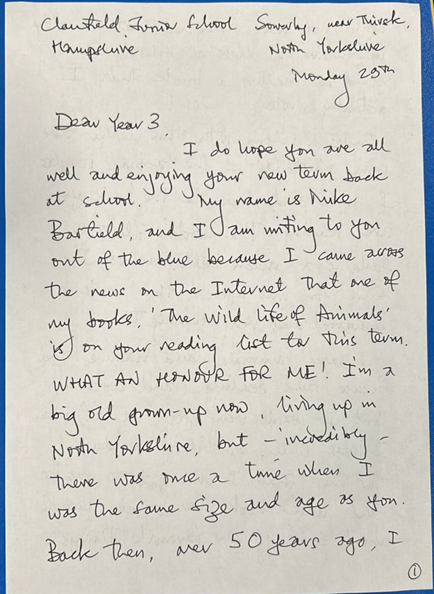 We have had the most amazing letter sent to us by Mike Barfield, the author of ‘The Wild Life of Animals’. He was thrilled to see we were studying his book and sent us a huge letter!